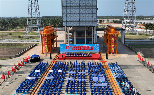 在文昌航天发射场,每次发射前都有一项特殊的“出征仪式”——火箭垂直转运。航天人深情凝望火箭活动发射平台上的鲜红国旗和动员标语,挥舞党旗、唱响红歌、誓师动员……这项特殊的仪式,见证着祖国航天事业的腾飞,也为重大航天发射任务注入不竭的精神动力。