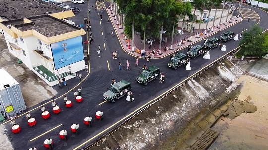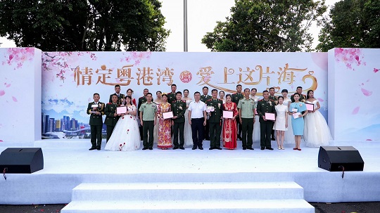 “爱意翻山渡海,终抵良人身畔。今天我们在此,和天空,和海疆,和舰艇一起见证这11对新人人生最重要的时刻。”随着爱情的烟花在天空绽放,幸福的汽笛在海疆长鸣,热烈的锣鼓在廊道敲响,11对新人在亲友和来宾的祝福中从海警舰艇缓步走向“情定粤港湾·爱上这片海”集体婚礼的舞台。
