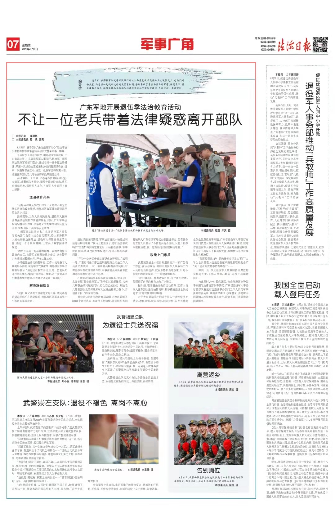 今年秋季士兵退役前夕,南部战区军事法院、广东省司法厅、广东省退役军人事务厅、解放军广州军事法院等军地部门联合,通过安排一堂专题法治授课、开展一次退役安置政策和涉法问题现场咨询、组织一次趣味普法互动、发放一批拥军优待政策手册,开展驻粤部队老兵专场法律和政策服务活动。