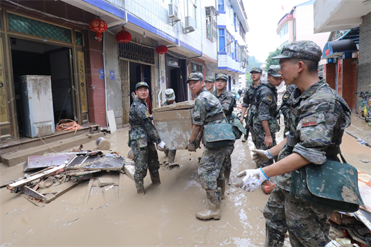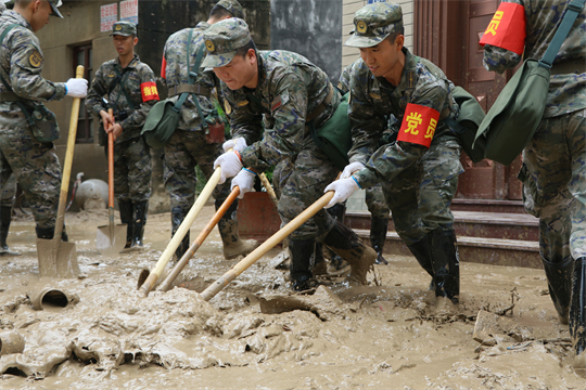 图为武警第二机动总队某支队救援官兵在搬运受损物资。薛东东 摄