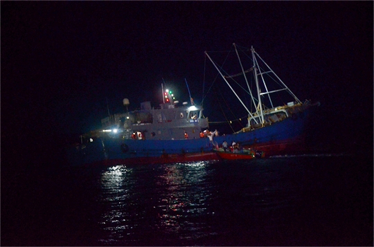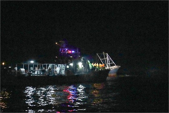9月20日晚,广东海警局在广东阳江黄程山岛附近海域救助一艘触礁搁浅渔船,船上载有26名渔民。