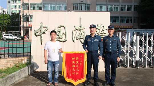 图为获救船员代表送上锦旗。