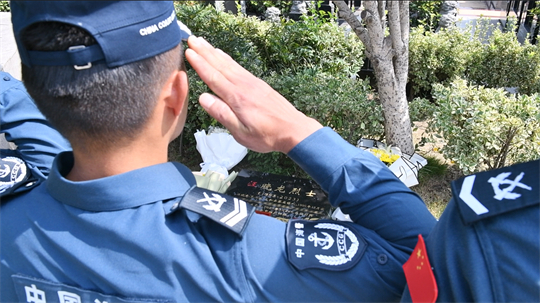 图为海警执法员在阜阳太和县烈士纪念馆。