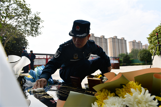 随后,海警执法员赶赴太和县万寿山烈士纪念碑广场,汪晓龙烈士的墓碑安放在这里。