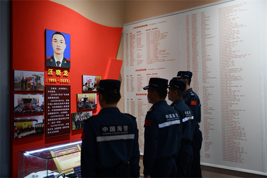 “这位是汪晓龙烈士,是我们阜阳太和人,生前是广东海警局执法员。”在太和县烈士纪念馆里,讲解员讲述着汪晓龙生前的先进事迹,在场人员聆听着英烈事迹,看着馆里展陈的汪晓龙烈士生前的遗物和工作照片,往事一幕幕浮现在广东海警执法员脑海中。