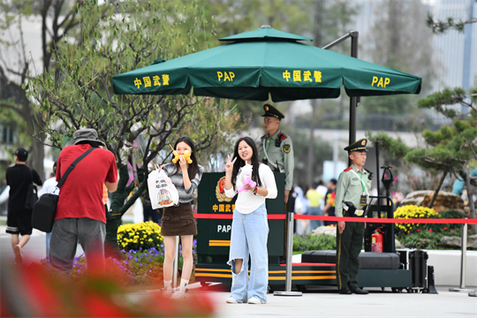 图为9月26日,武警安徽总队合肥支队执勤官兵在第十四届中国(合肥)国际园林博览会现场定点警戒执勤。