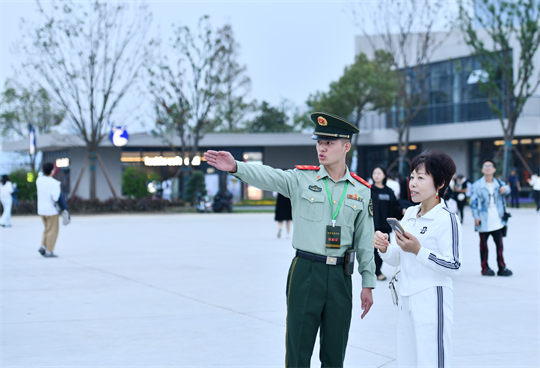 图为9月26日,在第十四届中国(合肥)国际园林博览会现场,武警执勤官兵为游客提供便民服务。