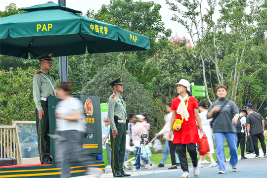 图为9月27日,武警安徽总队合肥支队执勤官兵在第十四届中国(合肥)国际园林博览会现场武装巡逻执勤。