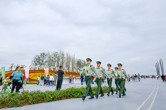 图为武警合肥支队执勤官兵在第十四届中国(合肥)国际园林博览会现场武装巡逻执勤。