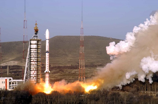 图为2006年4月27日,长征四号丙运载火箭首飞,发射遥感卫星一号。