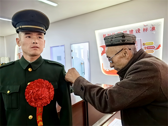 图为卡德尔大叔、古丽大妈来中队为退伍老兵邓凯送别,图为卡德尔叮嘱邓凯。黄超 摄