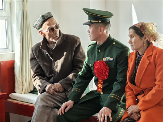 图为卡德尔大叔、古丽大妈来中队参加退伍老兵邓凯的退役仪式。黄超 摄
