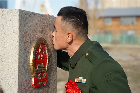 图为退伍老兵邓凯深情亲吻界碑。任勇 摄