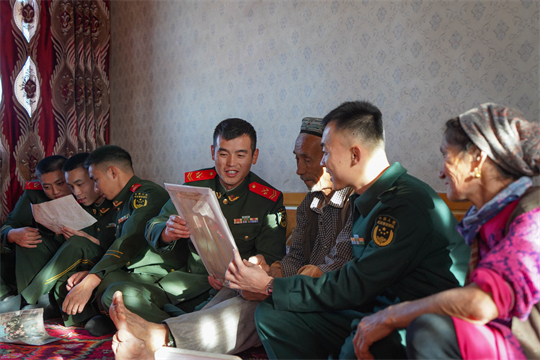 图为中队官兵来到老邻居卡德尔家,回顾军民鱼水情。张毅 摄