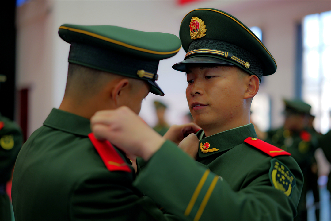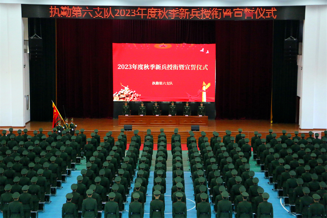 近日,武警北京总队执勤第六支队新兵大队举行2023年度秋季入新兵授衔暨入伍宣誓仪式。经过三个多月淬火锤炼,新兵们褪去青涩收获成长,迎来属于他们的“成人礼”。