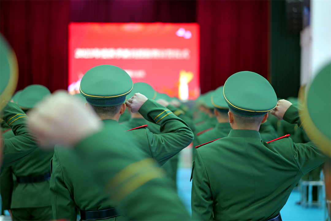 授衔仪式在庄严的国歌声中拉开序幕,全体新兵昂首挺胸、目光如炬。