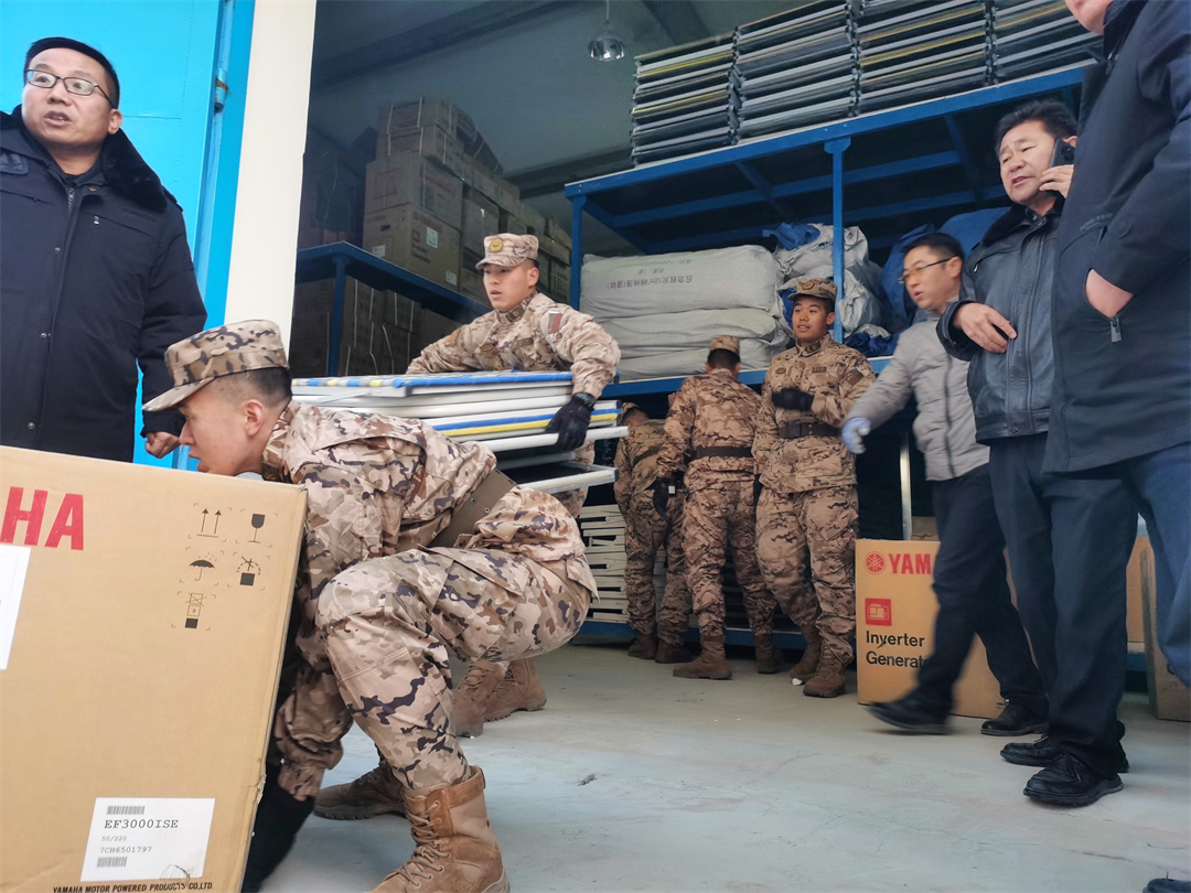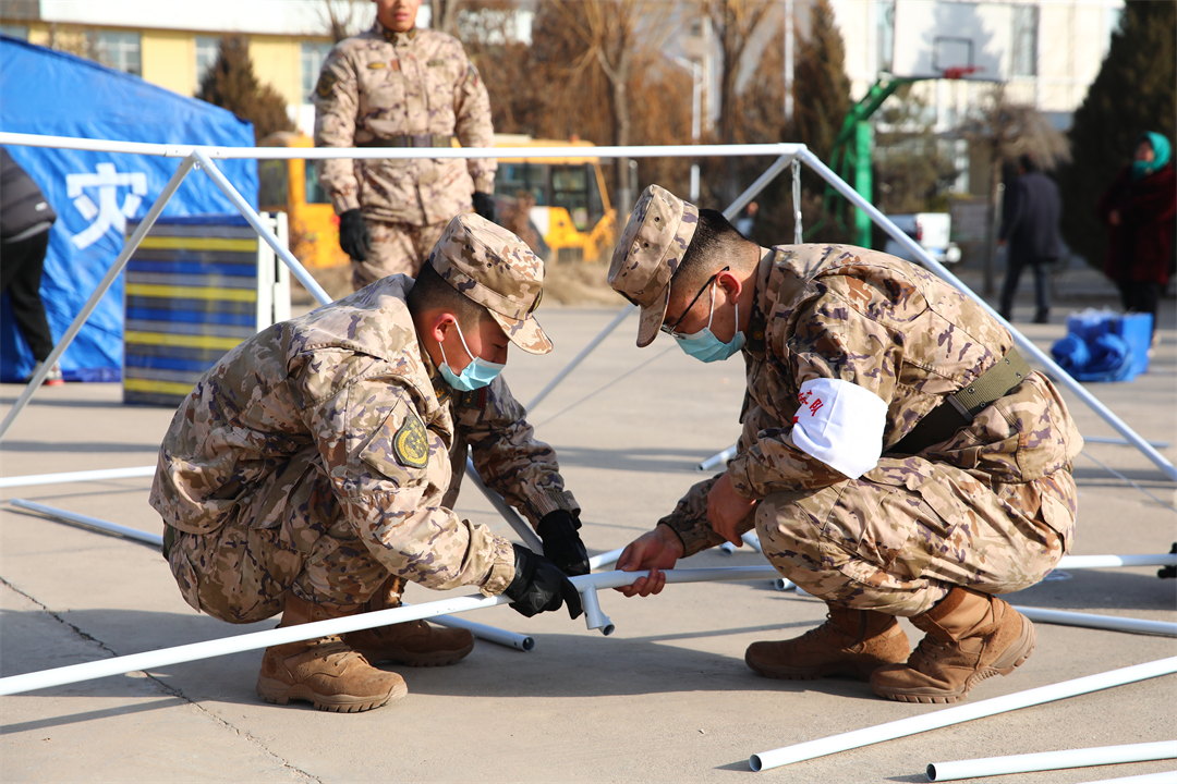 图为武警青海总队任务官兵正搭建救援帐篷。