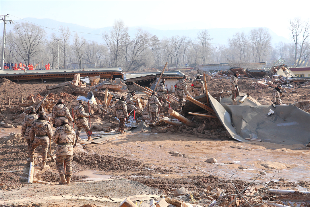 图为12月20日,武警青海总队机动一支队官兵在青海省海东市民和县中川乡草滩村泥石流现场进行搜救。罗元凯 摄