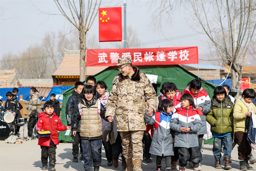压题图为在甘肃省积石山县刘集乡肖家村文化广场,武警甘肃总队机动支队官兵在野战炊事车上为受灾群众制作热食;在高李村临时安置点,武警甘肃总队医院医生与“武警爱民帐篷学校”的孩子们一起做游戏。侯崇慧 摄