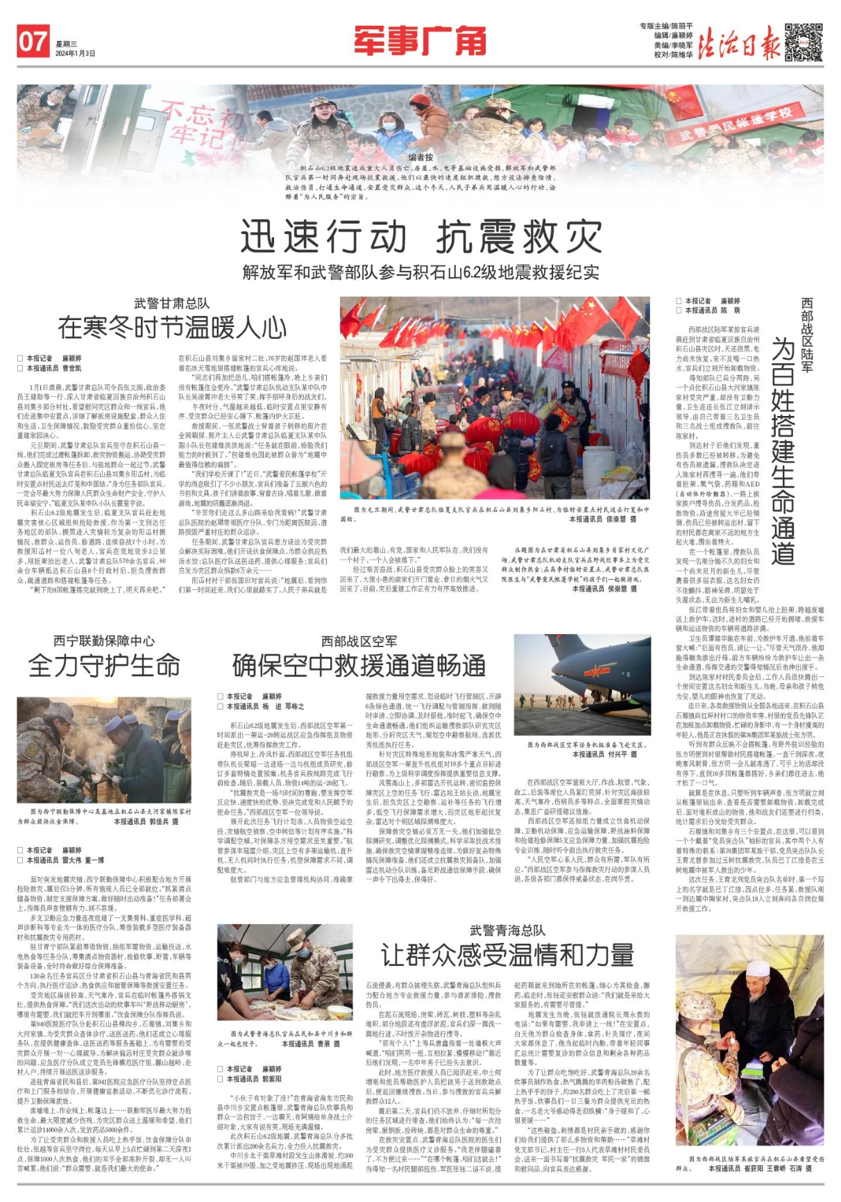“人民空军心系人民,群众有所需、军队有所应。”西部战区空军参与指挥救灾行动的参谋人员说,各级各部门都保持戒备状态,在岗尽责。