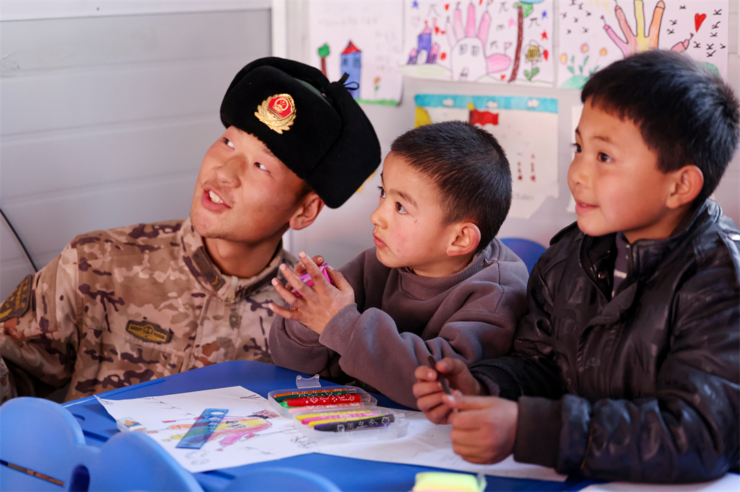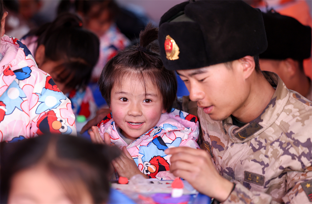 图为武警甘肃总队临夏支队官兵在甘肃省积石山县刘集小学临时教学点,带着孩子做手工喜迎新年。侯崇慧 摄