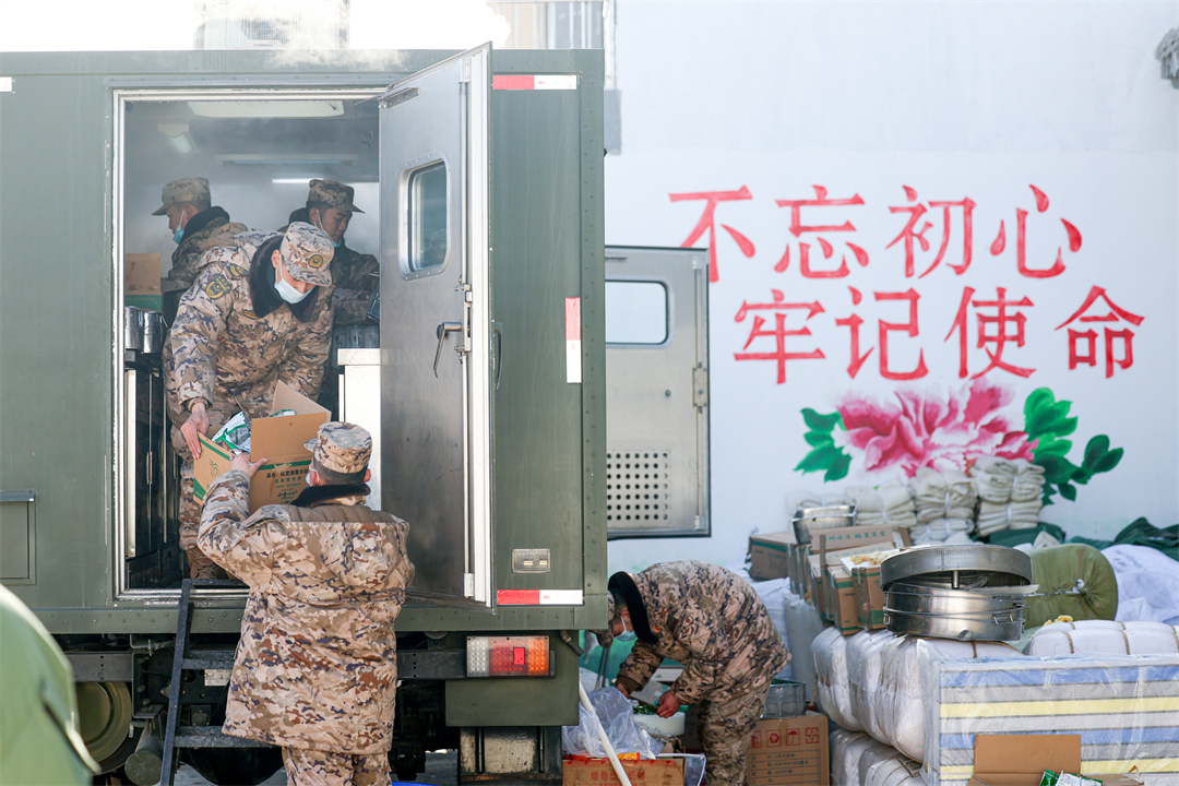 受灾地区海拔较高、天气寒冷,官兵在临时帐篷外搭锅支灶,提供热食保障。“我们这次出动的炊事车叫‘野战移动厨房’,哪里有需要,我们就把车开到哪里。”饮食保障分队指挥员说。