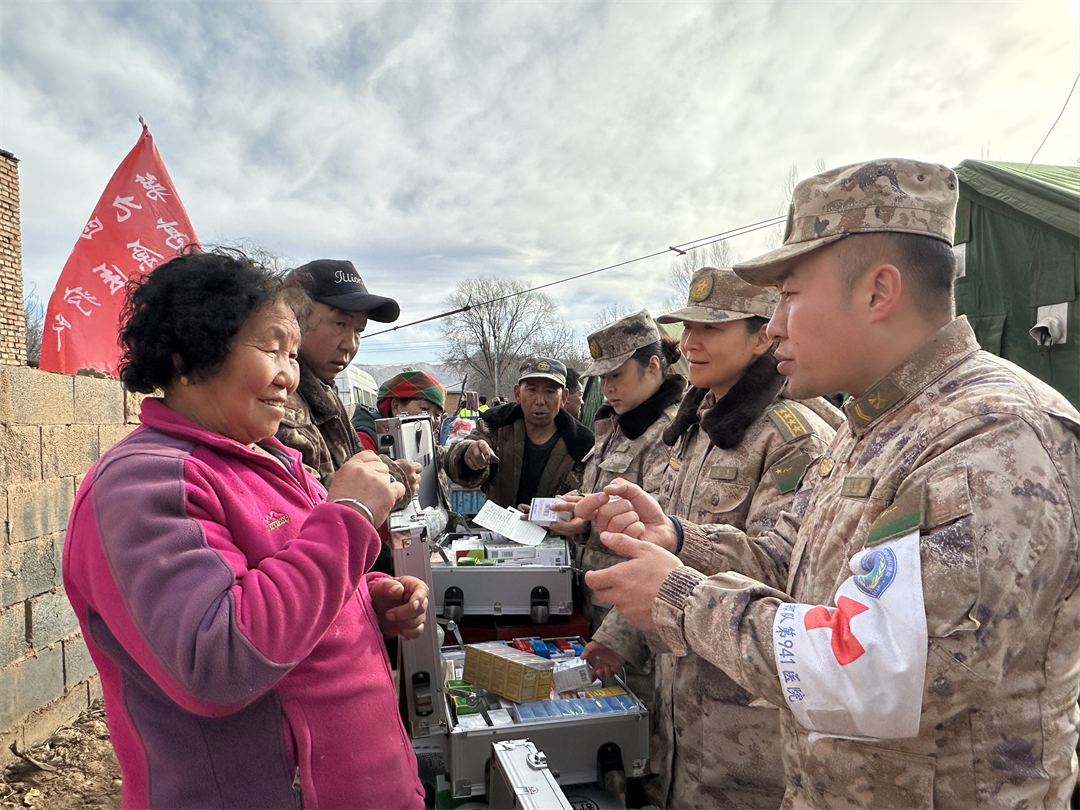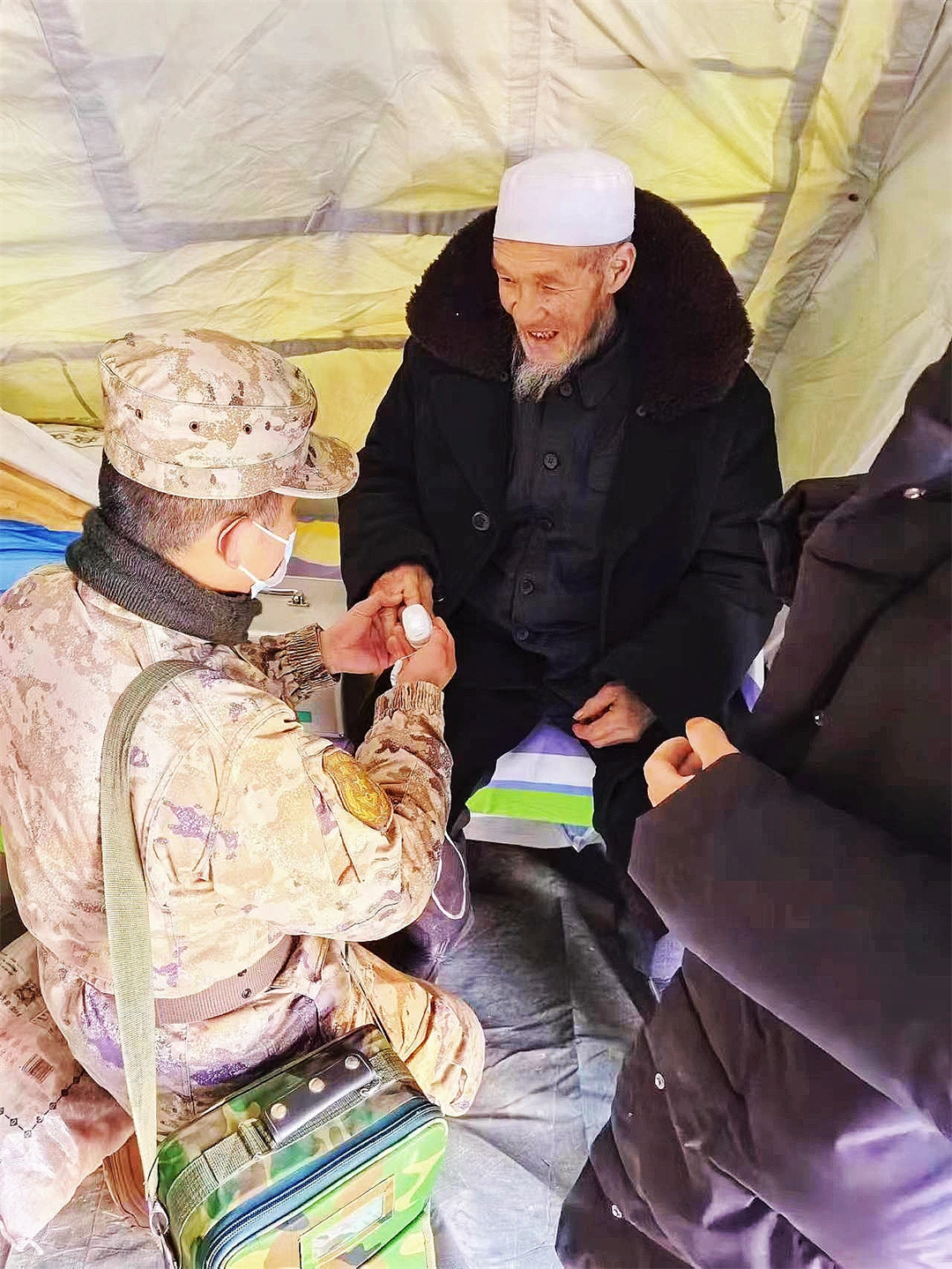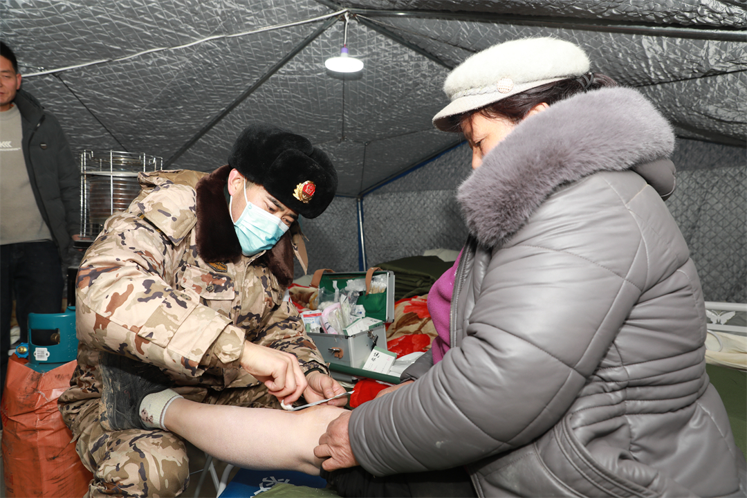 第940医院医疗队分赴积石山县柳沟乡、石塬镇、刘集乡和大河家镇,为受灾群众查体诊疗、送医送药。他们还成立心理服务队,在提供健康查体、送医送药等服务基础上,为有需要的受灾群众开展一对一心理疏导。为解决偏远村庄受灾群众就诊难的问题,应急医疗分队成立党员先锋模范医疗组,翻山越岭、走村入户,持续开展送医送诊服务。