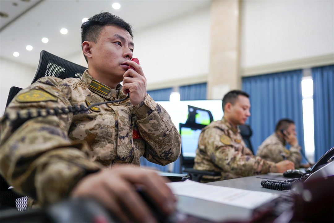 图为西部战区空军某中心航管参谋正在对受灾区域空域进行飞行调度。付兴平 摄