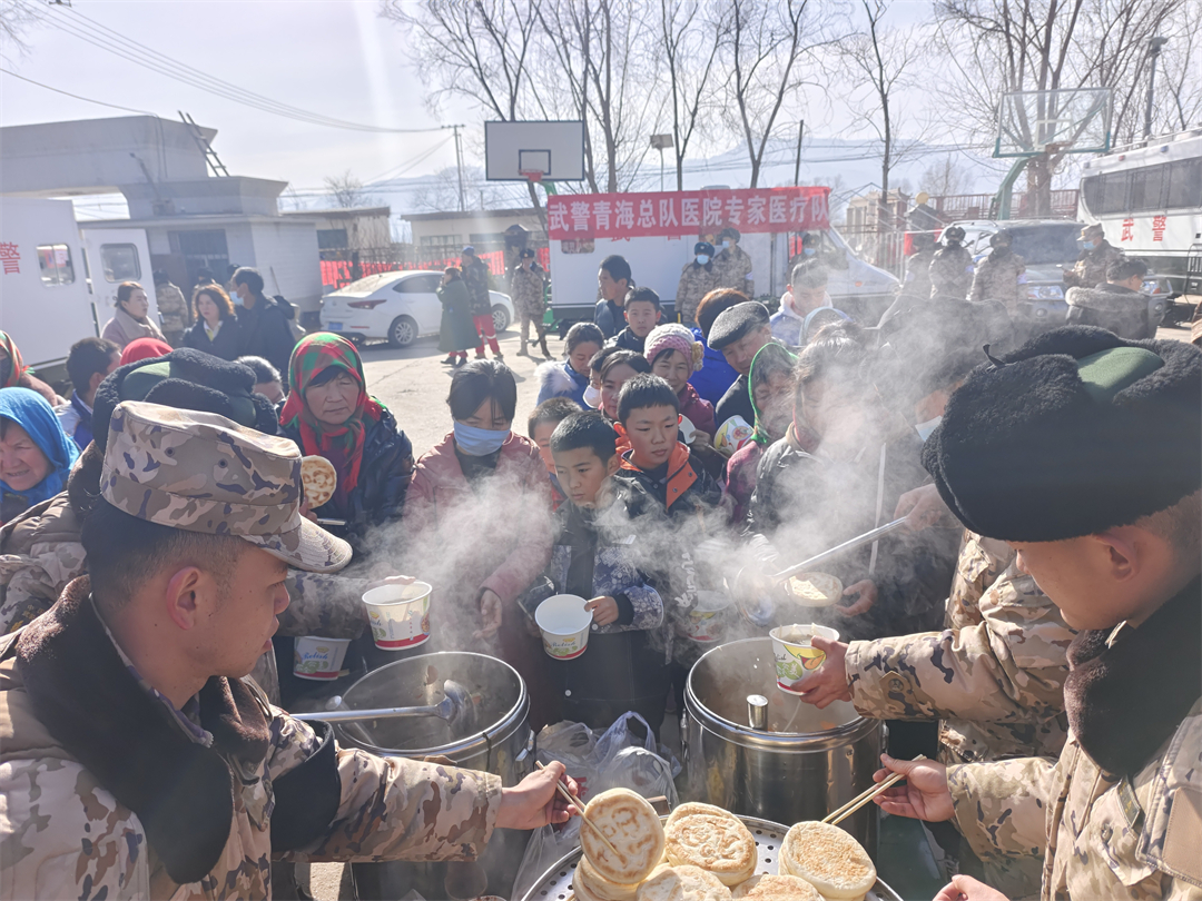 图为武警青海总队官兵为群众分发热食。李少平 摄