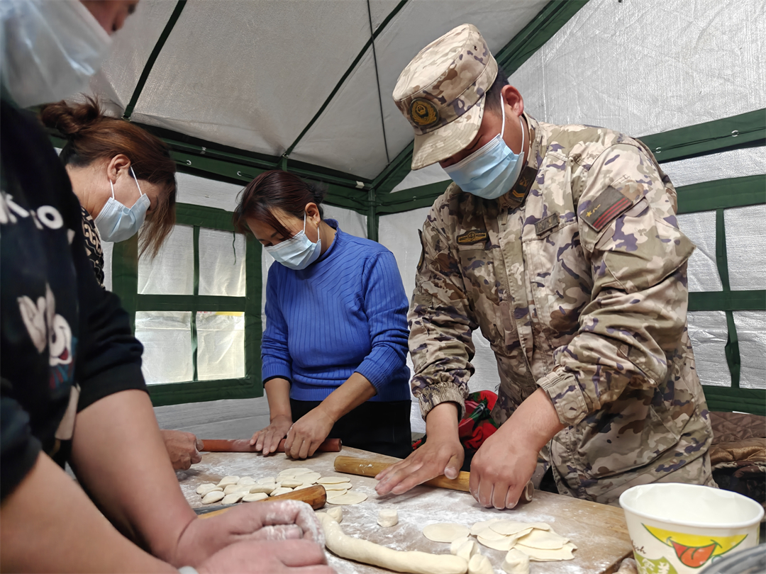 “小伙子有对象了没?”在青海省海东市民和县中川乡安置点帐篷里,武警青海总队炊事员和群众一边包饺子,一边聊天,有阿姨给单身战士介绍对象,大家有说有笑,现场充满温情。