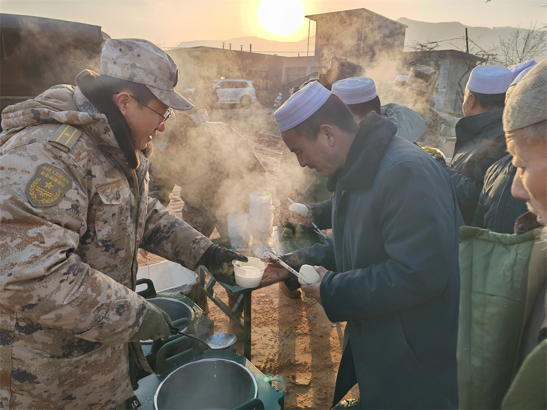 图为西宁联勤保障中心某基地在积石山县大河家镇陈家村为群众提供伙食保障。郭佳兵 摄