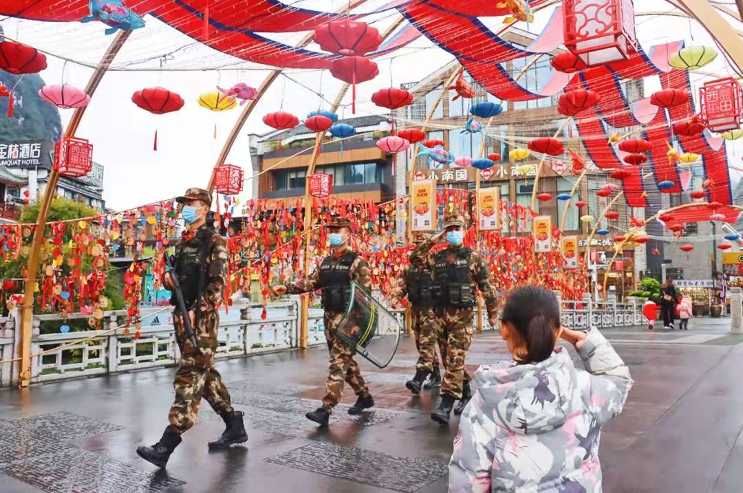 图为春节期间,武警阳朔中队官兵在阳朔西街开展巡逻勤务。