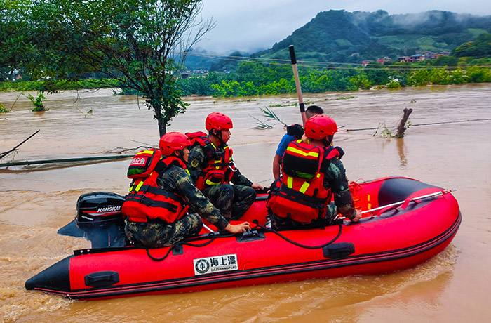 图为武警阳朔中队官兵参加抗洪抢险行动。