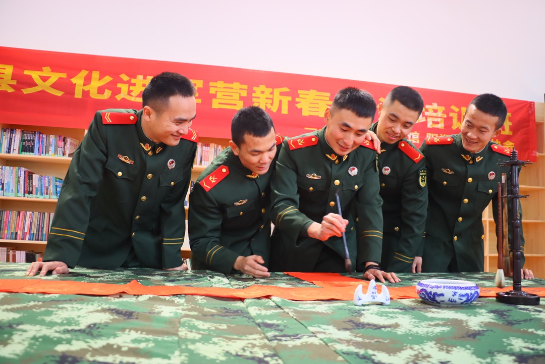 图为春节期间,武警阳朔中队官兵组织写春联。