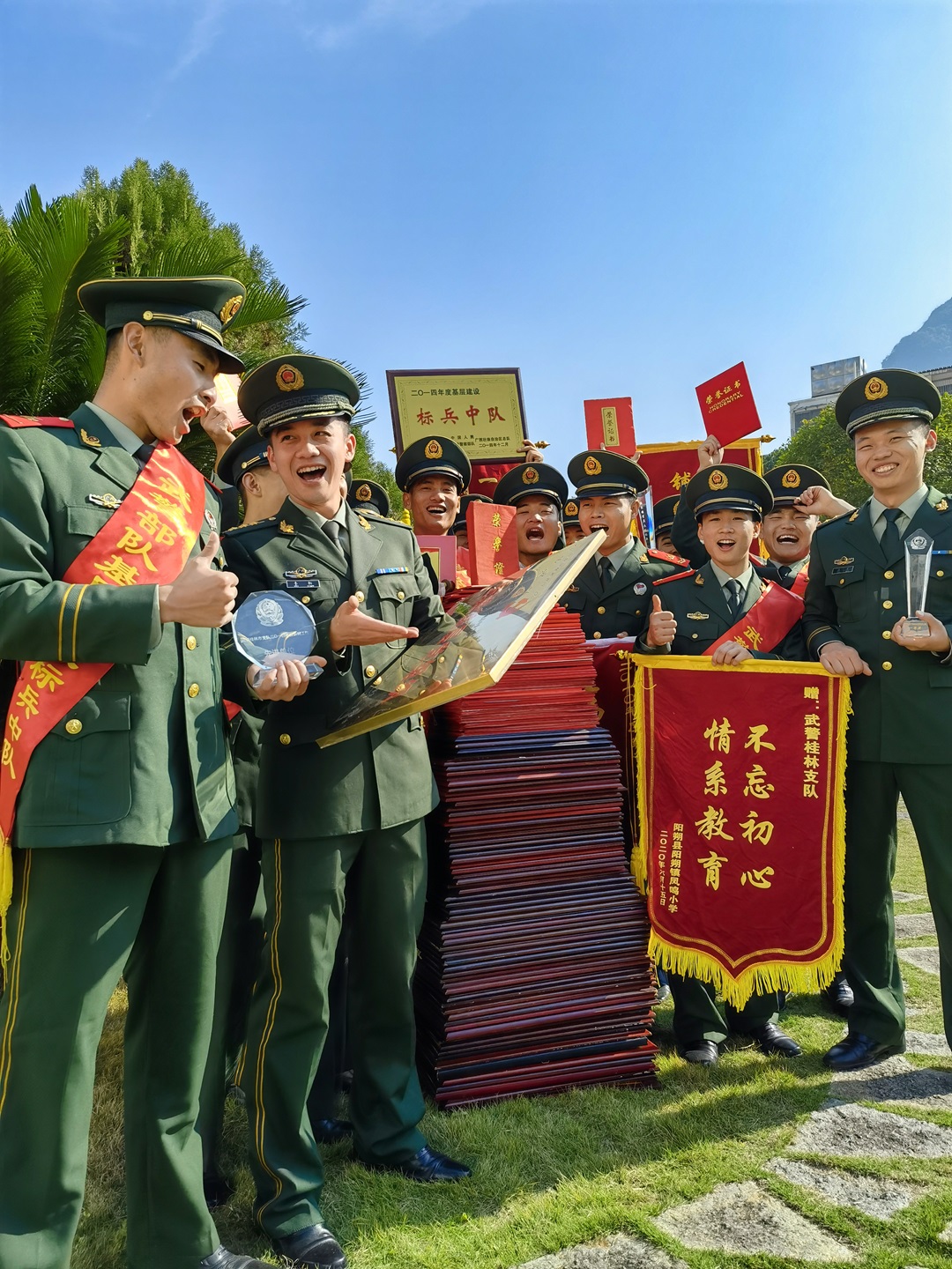 图为武警阳朔中队官兵与历年获得的荣誉奖牌合影。