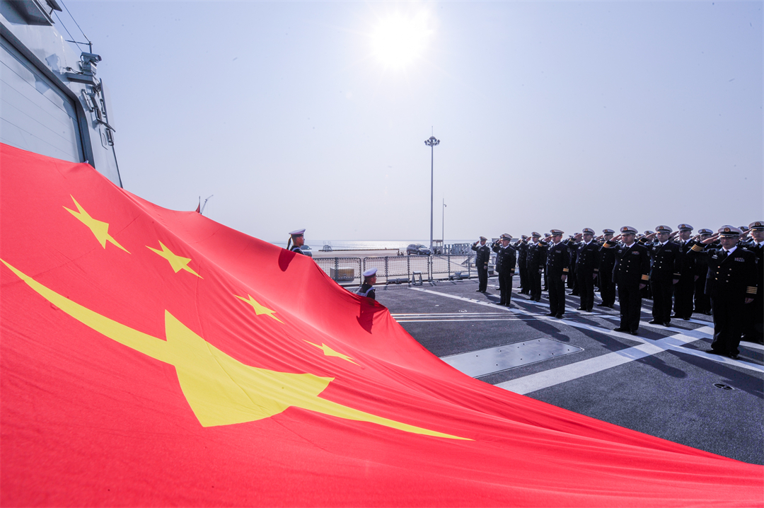 图为南昌舰官兵举行仪式,迎接南昌舰入列当天天安门广场升起的国旗。栾铖 摄