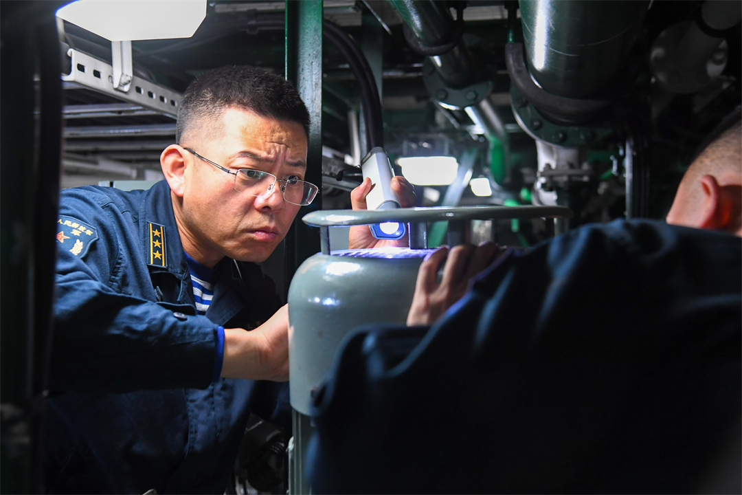 2021年,南昌舰赴某海域进行实战化训练。海面风平浪静,舰艇迅速占领阵位。机舱内各型设备高速运转,动力系统监控数据均显示正常。党员骨干都晓辉正对某设备进行检查,燃机箱装体玻璃壁上一层薄薄的油雾引起他的警觉。
