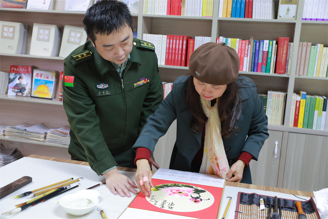 活动现场,湖南省文联的书画家们挥毫泼墨,把对部队的崇敬、对官兵的关爱倾注笔端,“厚德载物”“上善若水”“精武强能”“天道酬勤”等一幅幅饱含深情的书法作品跃然纸上。中美协会员、湖南省检察官文联美术顾问甘立东寥寥几笔勾勒出梅、兰、竹、菊,将写意与抒情交汇于纸上,展现了中国水墨画的独特韵味。官兵们在一幅幅翰墨佳作前驻足欣赏。