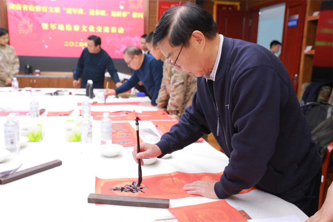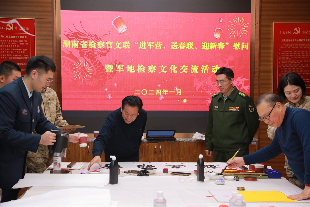近日,解放军长沙军事检察院携手湖南省人民检察院政治部、湖南省检察官文联开展“进军营、送春联、迎新春”慰问暨军地检察文化交流活动。