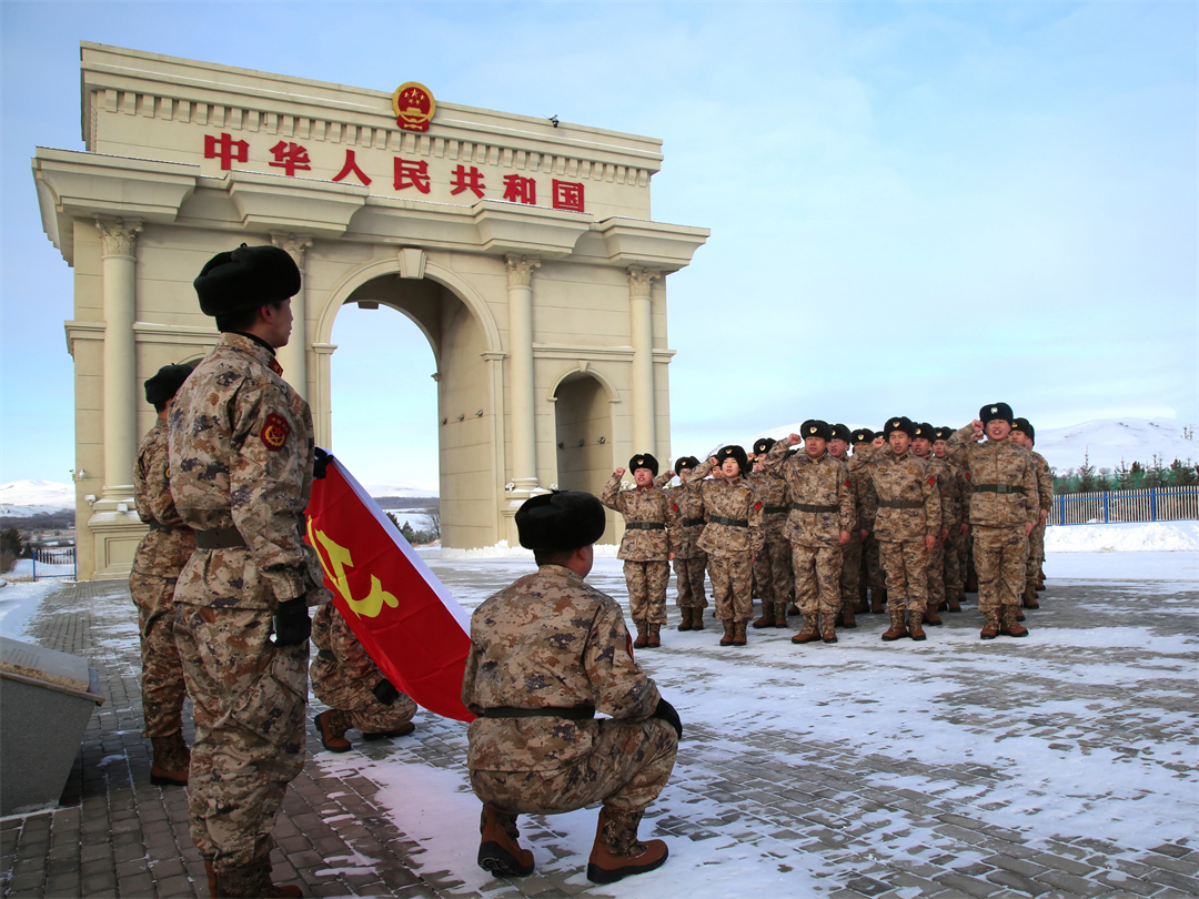 在祖国北疆的国门前,全体人员面向党旗庄严宣誓。大家紧握的拳头坚定有力,铿锵的誓言响彻云霄,表达着对党忠诚的坚定信仰和为国防事业不懈奋斗的决心。