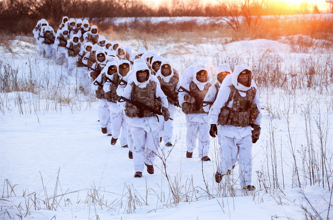图为陆军某边防旅“东方第一哨”官兵冒着严寒组织徒步行军。