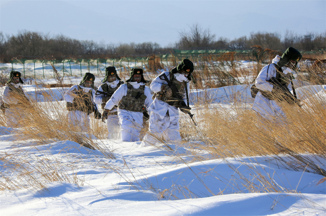 图为陆军某边防旅“东方第一哨”官兵冒着严寒巡逻执勤。