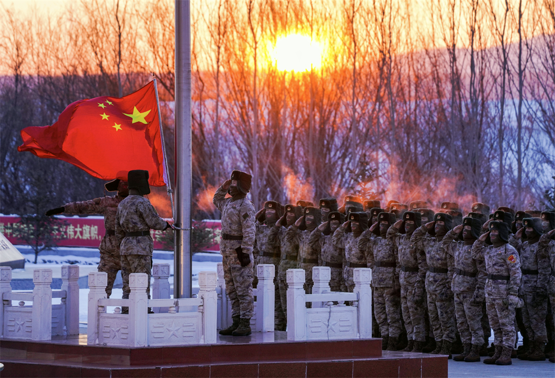 近日,驻守在黑龙江省抚远市黑瞎子岛的陆军某边防旅“东方第一哨”官兵迎着祖国第一缕朝阳,升起鲜艳的五星红旗。