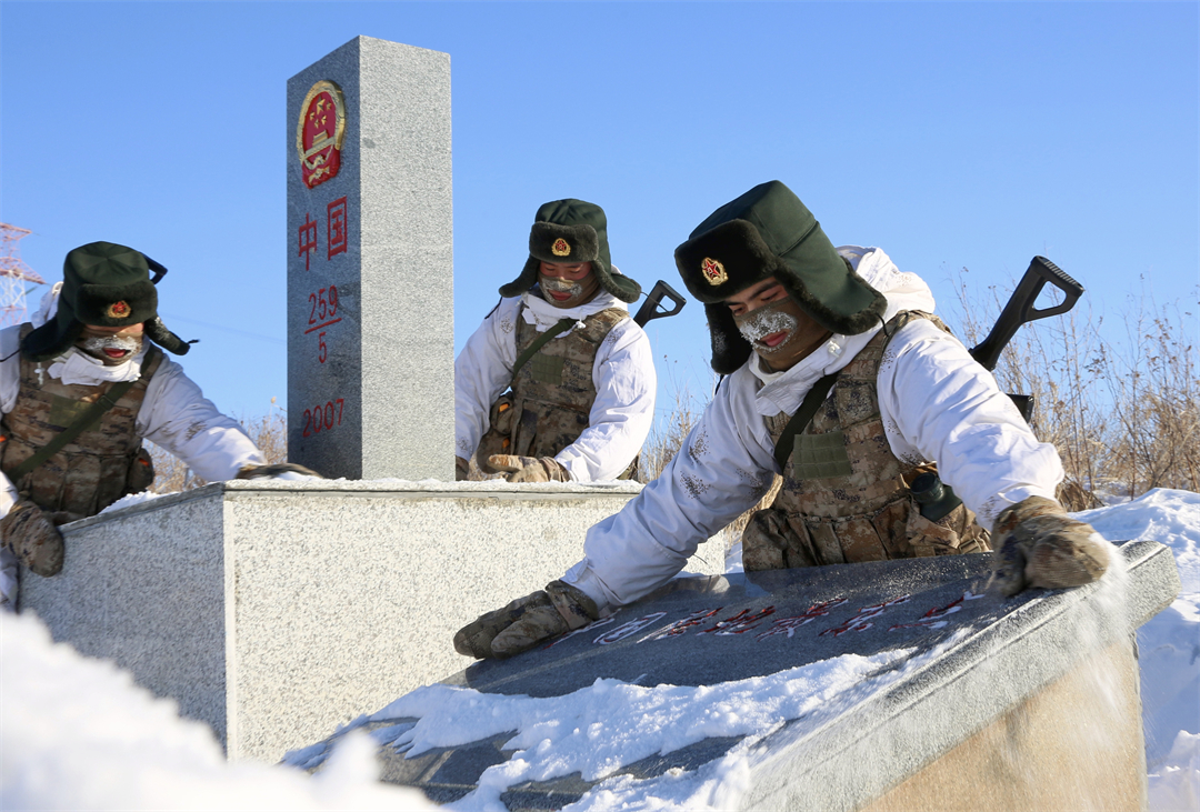 图为陆军某边防旅“东方第一哨”官兵在巡逻途中,清理界碑前积雪。