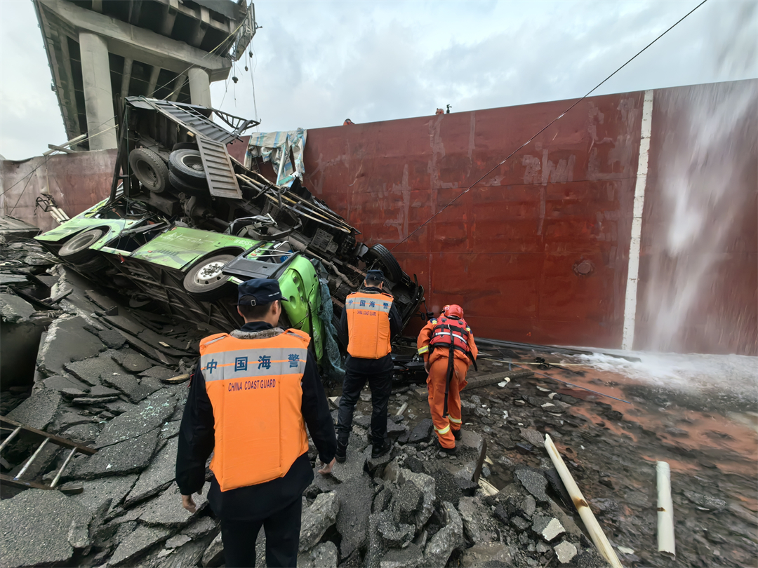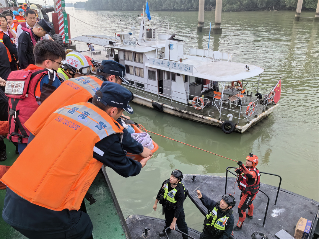 2月22日6时许,广州海警局接报警,南沙沥心沙大桥被撞,桥体断裂,桥上有车辆落水,情况危急请求救援。接警后,广州海警局立即启动海上应急救援预案,指派21523、21141等执法艇第一时间到达事发海域,联合消防、公安、海事等单位开展紧急救援。