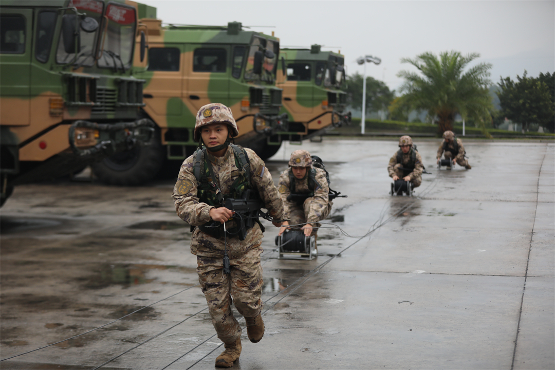 图为东部战区海军某团组织突击群指挥员资质认证考核,号手快速铺设光缆。付琪皓 摄