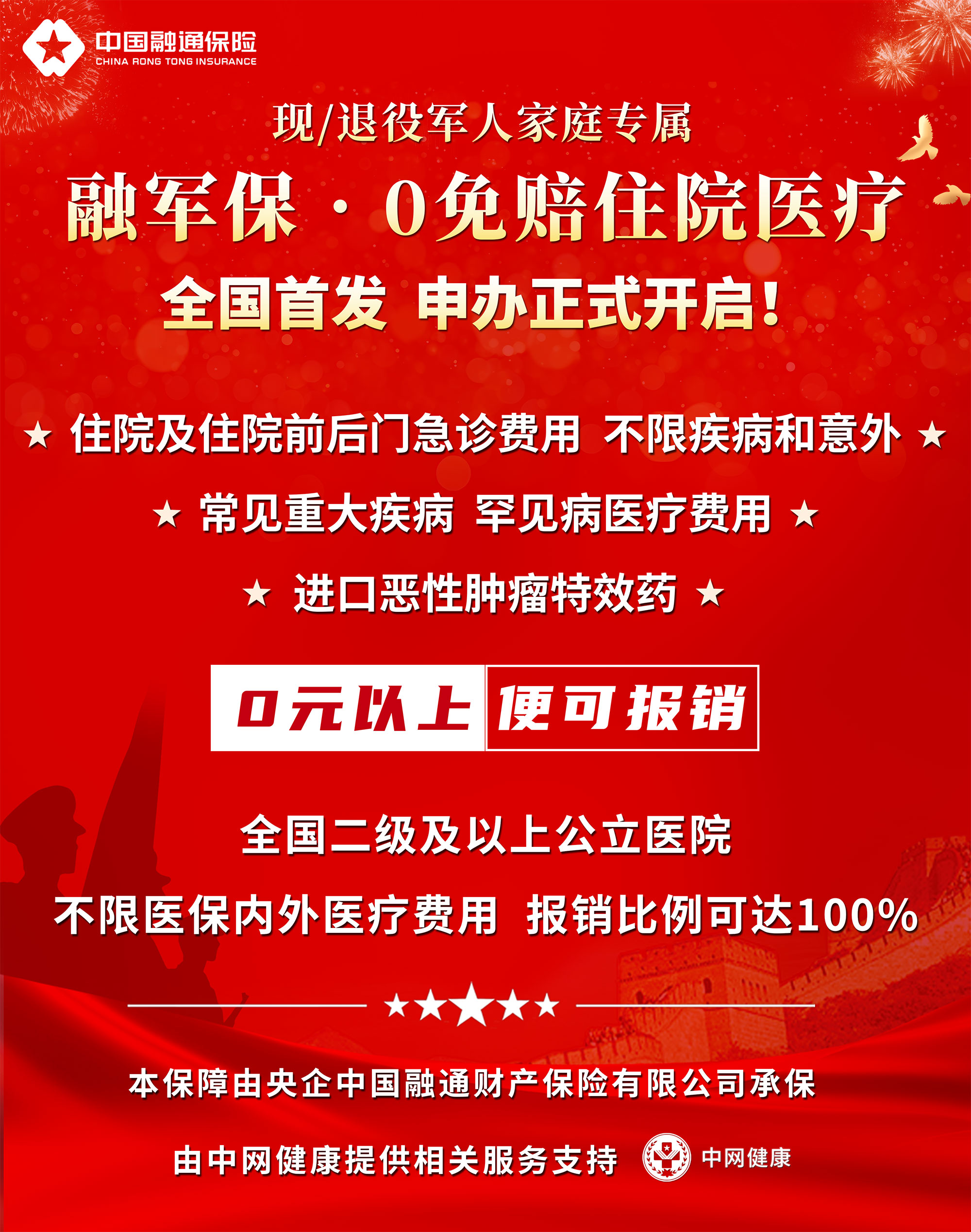 为深入贯彻落实党的二十大关于退役军人工作重要部署,履行“为军惠军”职责使命,体现中央企业服务经济社会高质量发展的“国家队、排头兵”作用,进一步提升退役军人保险保障水平。中国融通保险发挥自身为军服务“专门化、专业化”服务优势,聚焦现/退役军人家庭医疗现实需求,于2024年3月14日,联合中网健康正式上线了《融军保·0免赔住院医疗》保险产品。此产品由中国融通保险全面负责定制研发,由中网健康提供相关配套服务支持。该保险因其“0免赔”的保障优势,真正实现了“看病住院,小钱、大钱均可报销”。