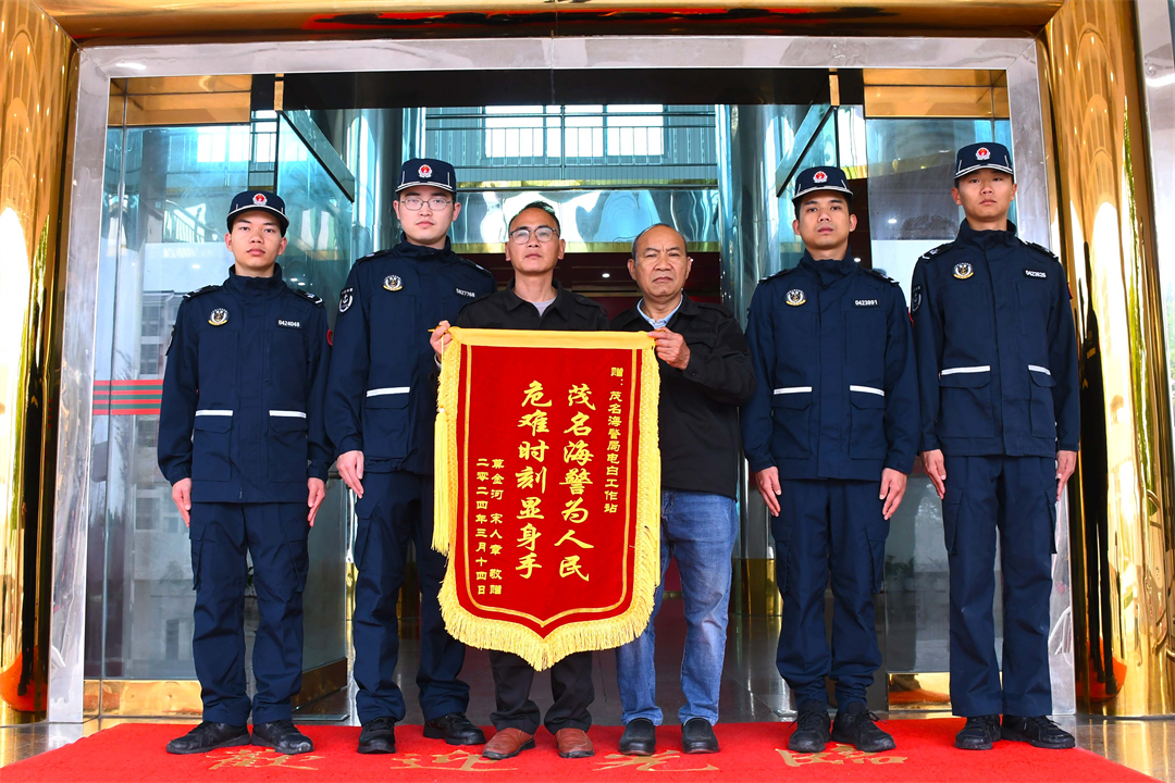 3月14日下午,水东湾海洋公园两名工作人员携带一面印有“茂名海警为人民 危难时刻显身手”的锦旗,来到广东茂名海警局电白工作站,专程向对其实施救援的海警执法员表示感谢。