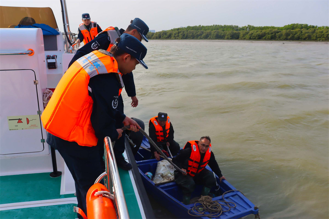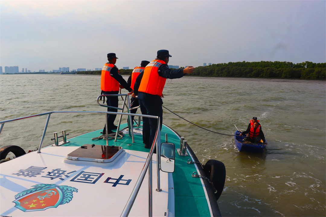 此时,潮水跌宕起伏,执法艇在海浪中不断摇晃,几次试靠均未成功。执法员遂重新研判现场态势,锁定目标点后果断靠帮,将受困群众转移至执法艇。确定无碍后,执法员将其送至陈屋村码头岸上。据悉,两名受困群众系水东湾海洋公园清理人员,作业期间因风浪较大被困大洲岛,幸亏海警执法员及时救助得以脱险。