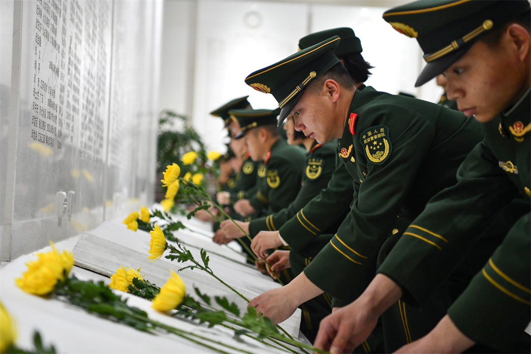 图为3月27日,武警合肥支队官兵向渡江战役烈士献花。